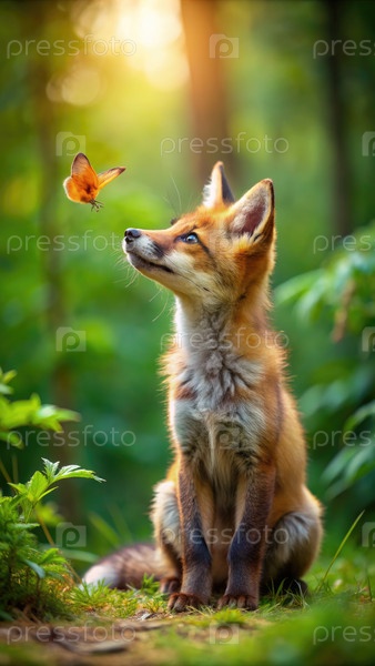 Красная лиса смотрит на Бабочку, генерируя ИИ