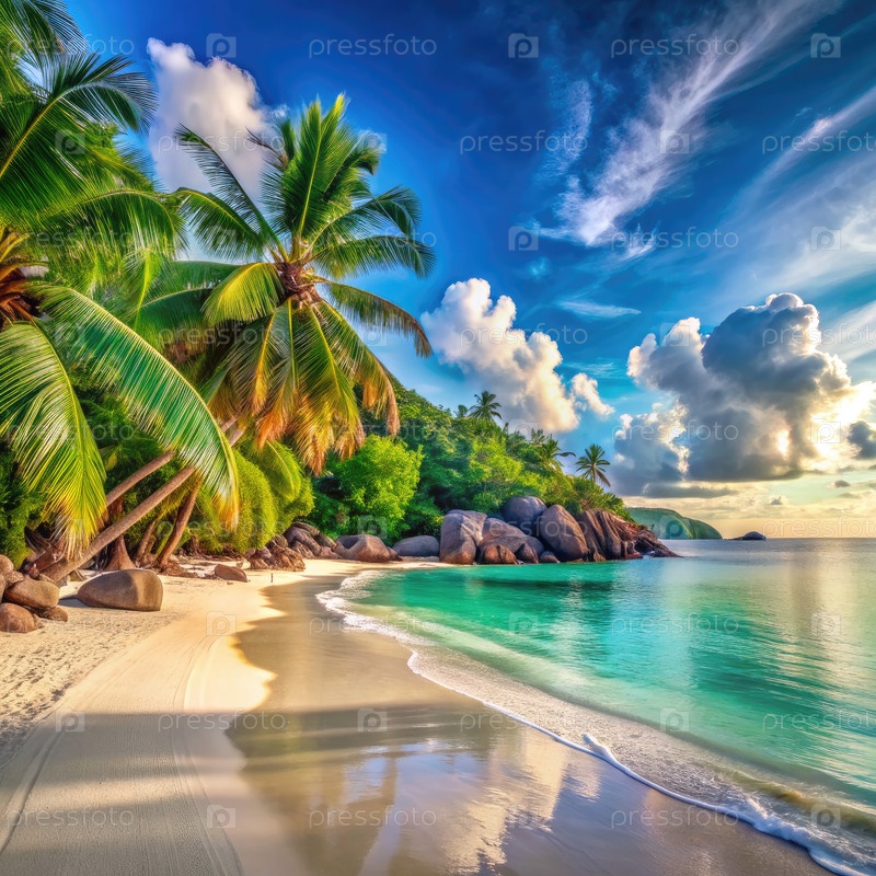 Спокойный пляж с пальмами и голубой водой