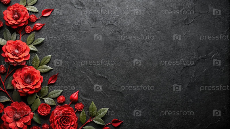 Красные цветы и листья на черном фоне