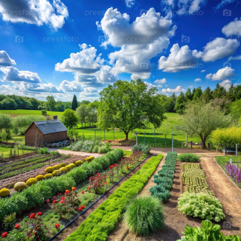 Плодоносный сад с амбаром на заднем плане, генерирующий ИИ