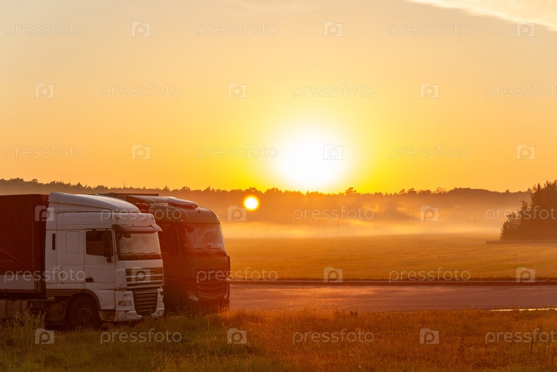 Солнце восходит над двумя припаркованными грузовиками на обочине дороги, с туманом в поле