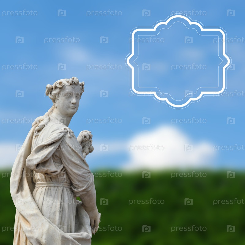 Классическая мраморная статуя Флоры изолирована на фоне голубого неба с облаками и зелеными растениями.Изолированный картридж для надписи