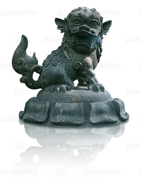Буддийская бронзовая фигура снежного льва на цвете лотоса изолирована на белом фоне