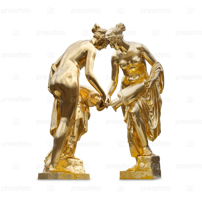 Золотые статуи девочек с кувшином на белом фоне