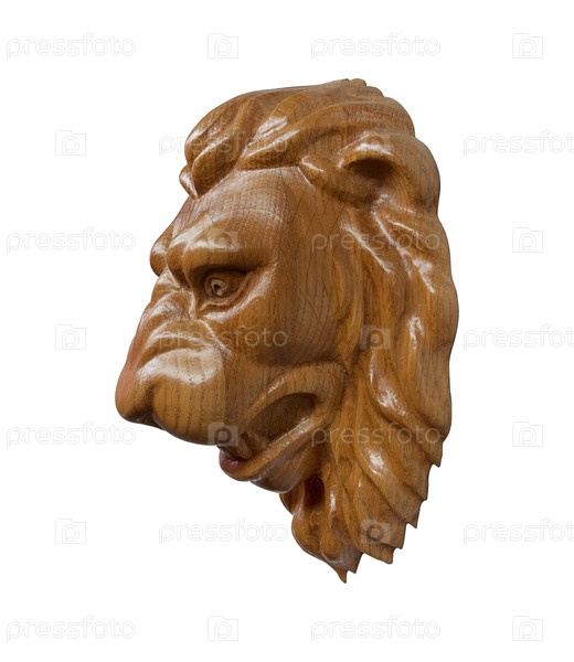Деревянные архитектурные детали изолированы на белом фоне. Голова рычащего льва. Обрезанный элемент дизайна