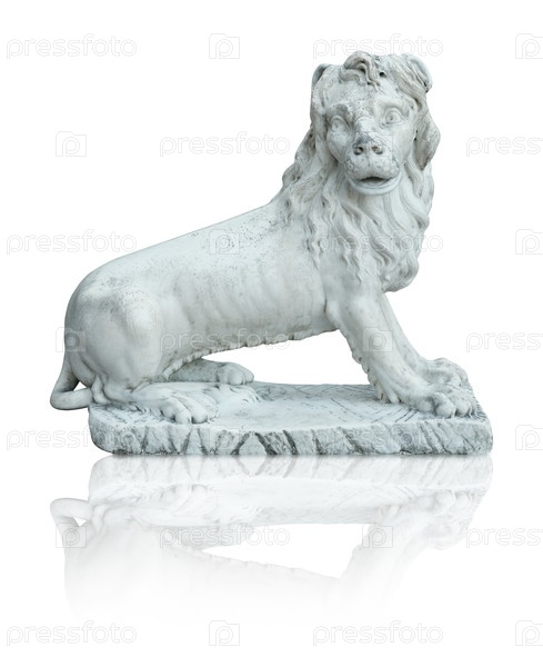 Полноразмерная статуя белого мраморного льва изолирована на белом фоне с отражением, чрезвычайно высокого разрешения, обрезающим путь