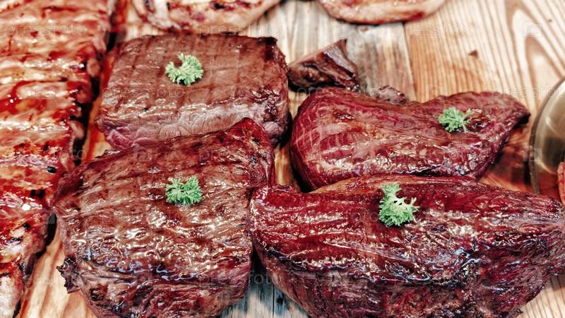 Стейки, кусочки жареного мяса, выложенные на деревянной поверхности