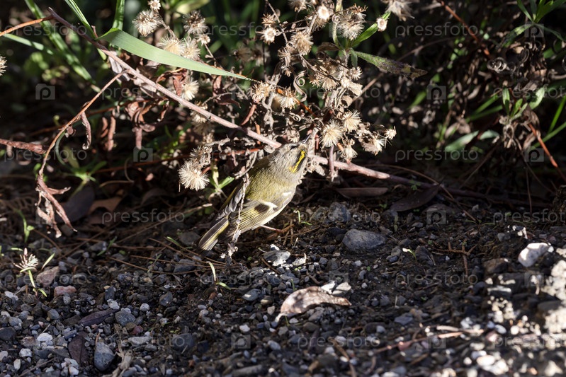 Близкий план золотого короля (Phylloscopus proregulus), одной из самых маленьких птиц в Европе
