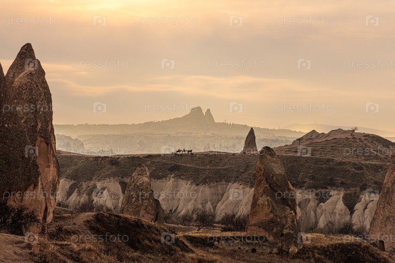 Лошади среди каппадокийских скальных образований на закате, Турция
