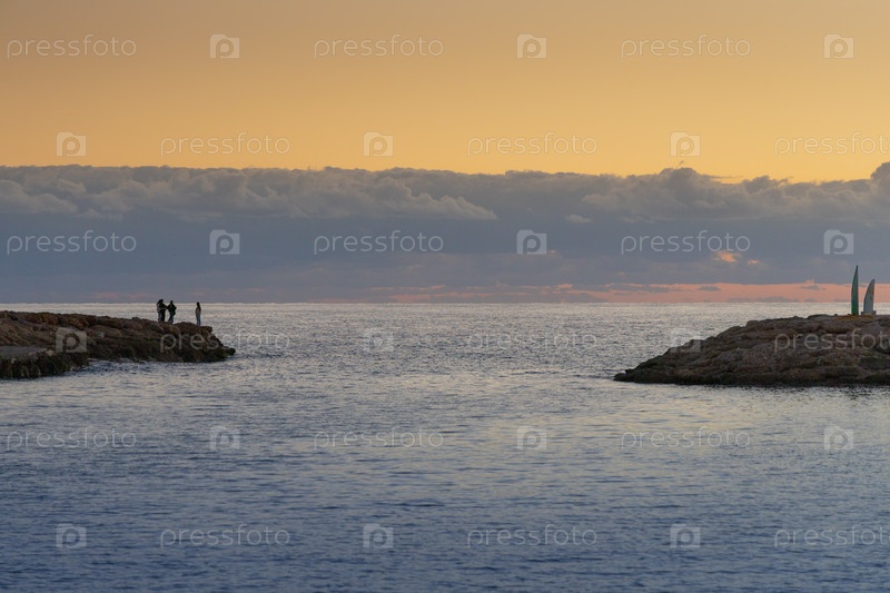 Люди на скалах у моря при закате солнца, спокойный морской пейзаж