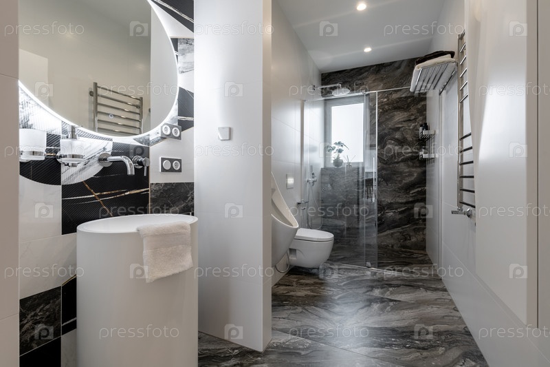 Широкоугольный интерьерный снимок современной дизайнерской ванной комнаты с белой раковиной на пьедестале, большим круглым зеркалом со светом, стеновым мочеиспускателем и стеклянным душем с роскошными мраморными плитками и ярким освещением окружающей сред