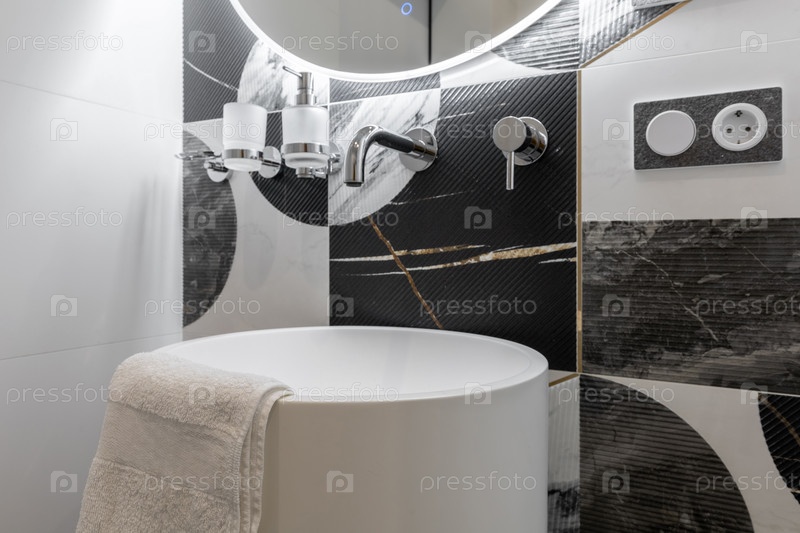 Закрытый современный интерьер ванной комнаты с минималистической белой цилиндрической пьедестальной раковиной, хромированным стеновым краном и декоративными черно-белыми стеклянными плитками с мраморными текстурами и геометрическими узорами