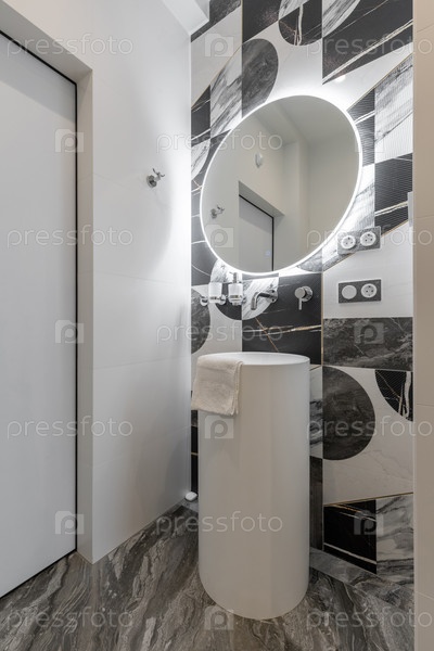 Вертикальный вид современной ванной комнаты с белой цилиндрической пьедестальной раковиной, большим круглым зеркалом с ореолом светодиодного освещения и декоративной стеной с черно-белыми геометрическими мраморными плитками