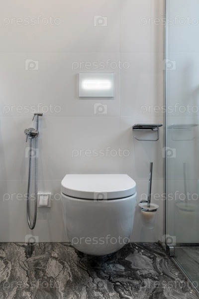 Современная ванная комната со стеновым туалетом и темным мраморным полом