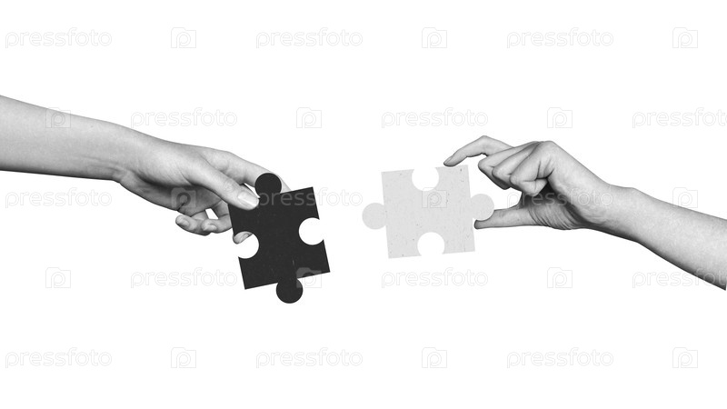 Современный коллаж с двумя руками соединяет кусочки головоломки. Концепция командной работы, бизнес-идея, мозговой штурм. Креативность. Слияние организаций. Партнерства