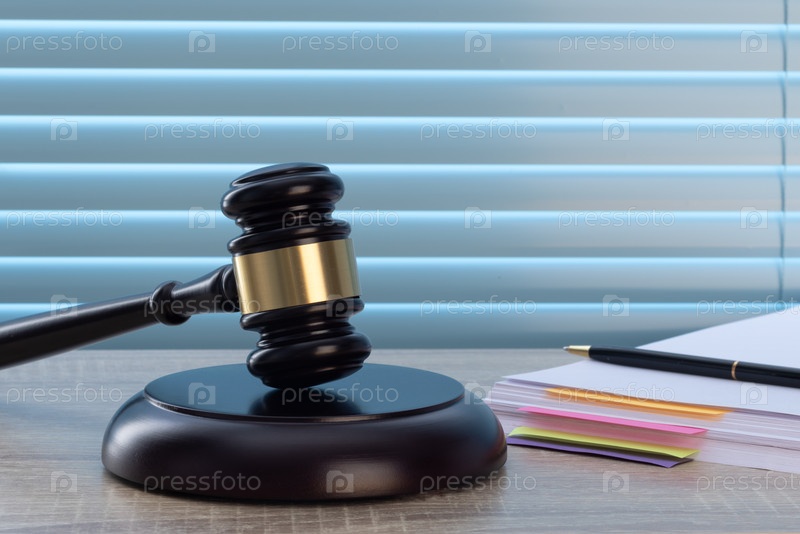 Судейский молоток, бумага и шариковая ручка