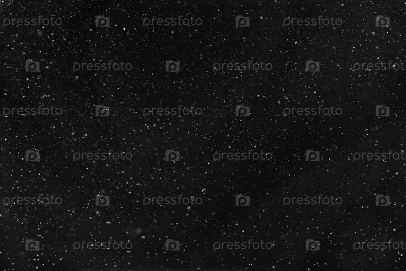 Наложение текстуры снега с очень маленькими размытыми белыми частицами, падающими на изолированный темно-черный фон горизонтально