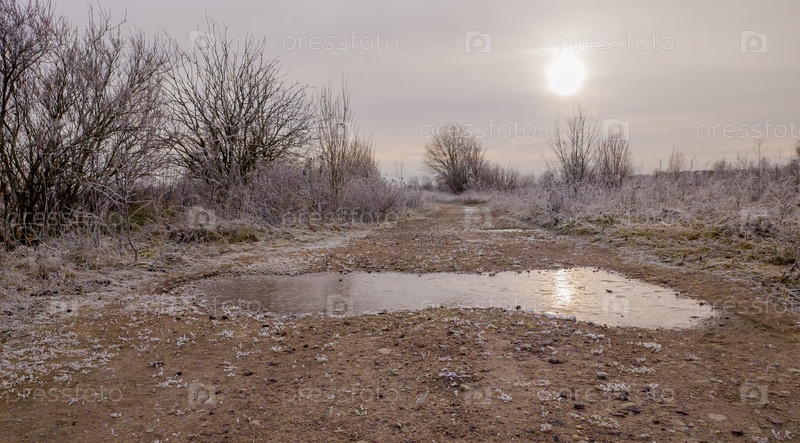 Ландшафт замерзшей тропы с лужайками, отражающими солнце.Зимняя концепция естественного света и наружного освещения.Холодные погодные условия для прогноза погоды