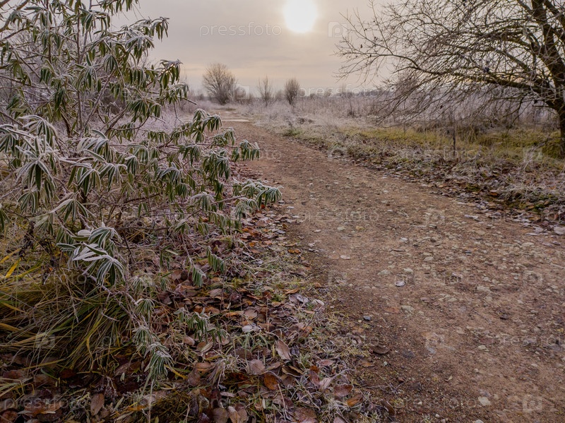 Замерзшая грунтовая дорога в зимнем пейзаже с замороженными растениями, концепцией холодной погоды и природой для путешествий