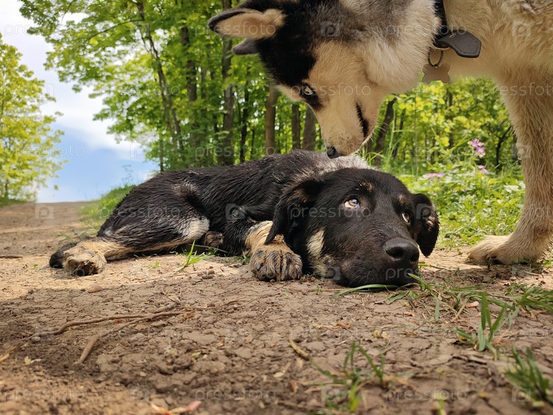 Хаски смотрит на грустного щенка, лежащего в лесу. дружба с животными и отношения с дикой природой