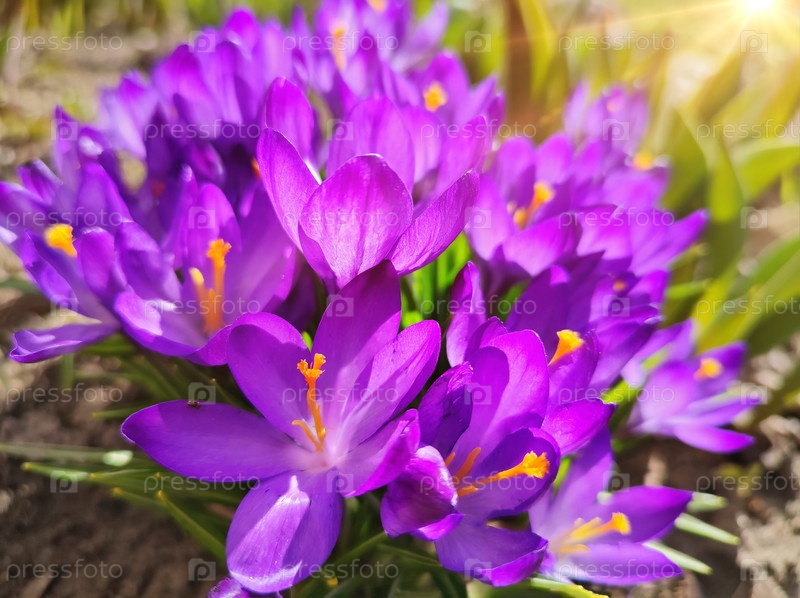 Группа фиолетовых шафронов цветет в весеннем саду при солнечном свете. ранние весенние цветковые растения для Пасхи и концепции весны