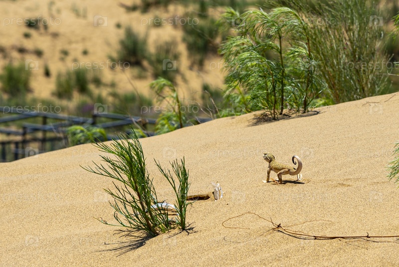 Любопытная ящерица исследует песчаные дюны с зеленой растительностью