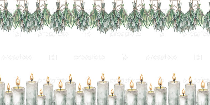 Горизонтальный каркас с гроздьями травы, висящими на веревке и горящими свечами. Акварельная иллюстрация на изолированном фоне. Шаблон с пустым местом для вставки на Хэллоуин