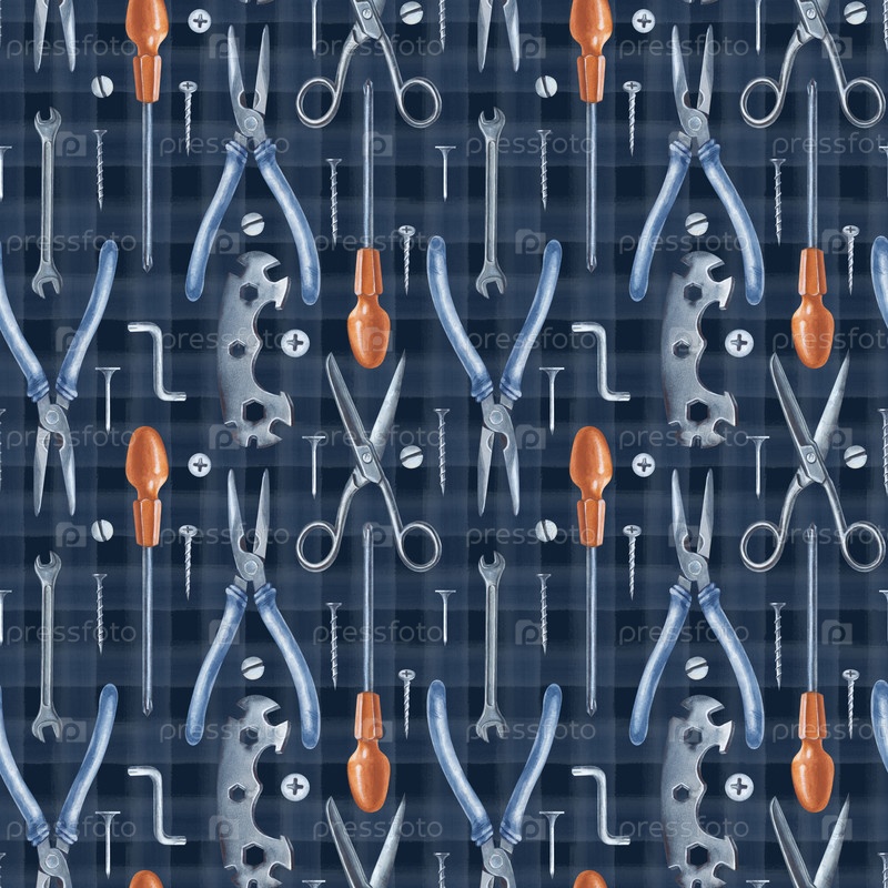 Бесшовный вертикальный рисунок с рабочими инструментами на темном фоне в клетке. Иллюстрация акварели с реалистичными железными инструментами для ремонта дома. Шаблон для проектирования строительных и ремонтных предприятий, упаковки и печати