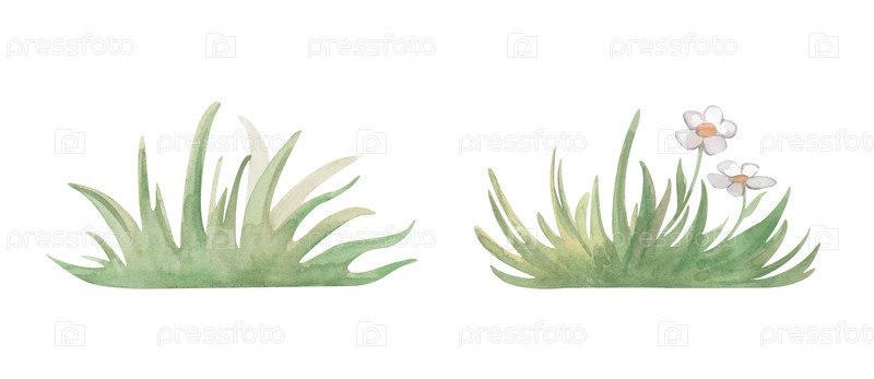 Набор из двух букетов зеленой травы с белыми цветами и без них, в естественных тонах. Акварельная иллюстрация на изолированном фоне. Ботанический клипарт с изображением травы для летнего декора