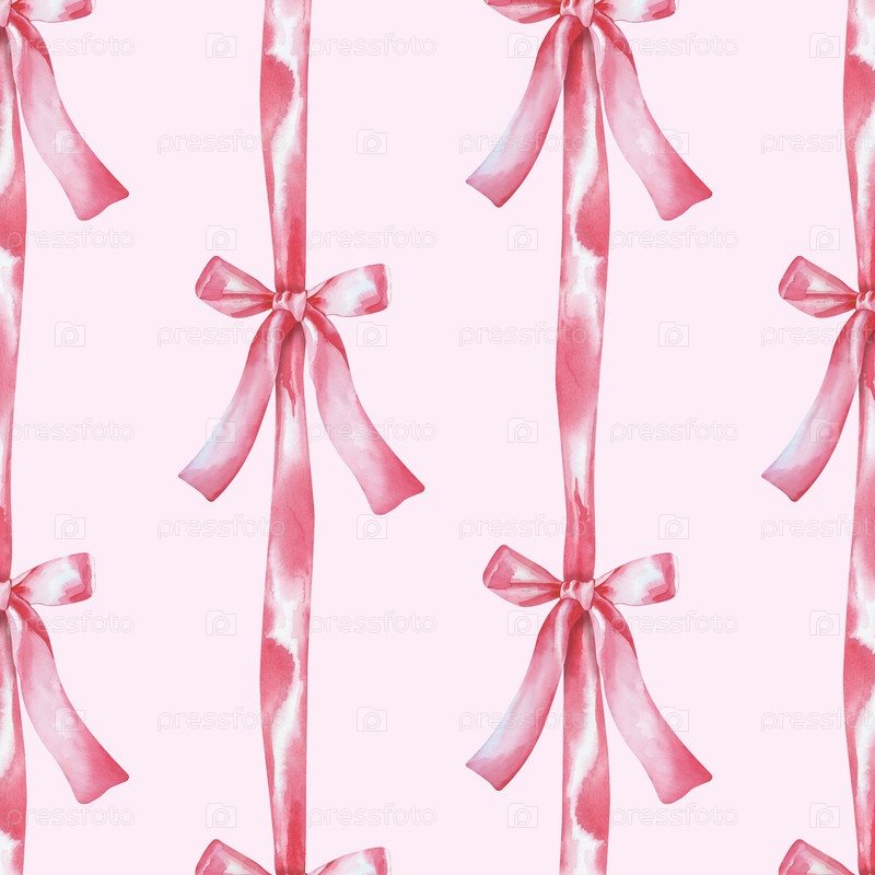 Вертикальный бесшовный рисунок с розовыми лентами на розовом фоне. Акварельная иллюстрация с праздничными луками. Реалистичный фон для обоев, упаковки, тканей, текстиля, открыток, плакатов