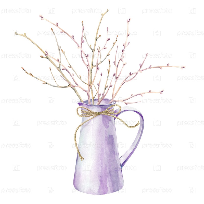 Нежный состав белого кувшина, перевязанного шпагой, с безлистными ветвями. Акварельная иллюстрация на изолированном фоне. Весенний клипарт сезонного домашнего декора для украшения весенних тем и пасхального праздника