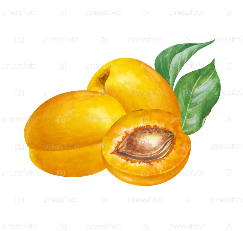 Акварельная композиция с несколькими абрикосами и зелеными листьями на изолированном фоне. Ботаническая иллюстрация с целыми плодами и половиной с камнем. Реалистичный фруктовый клипарт для дизайна продуктовых линий