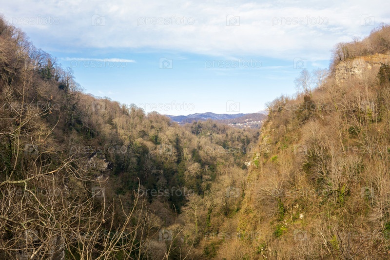 Долина и лес в зимних горах Кавказа