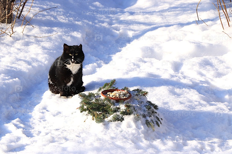 Пушистый, пухлый кот сидит в сугробе рядом с кормушкой для птиц, пытаясь украсть немного сала. Сильные зимние морозы не задевают сибирских кошек, которые не боятся холода. Понятие сострадания