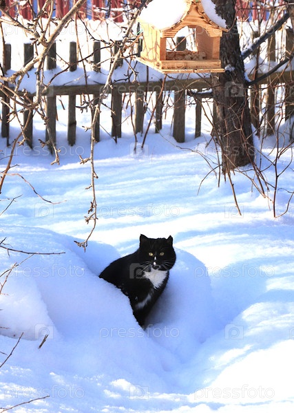 Пушистый, пухлый кот сидит в сугробе под кормушкой для птиц, пытаясь украсть немного сала. Сильные зимние морозы не задевают сибирских кошек, которые не боятся холода. Понятие сострадания