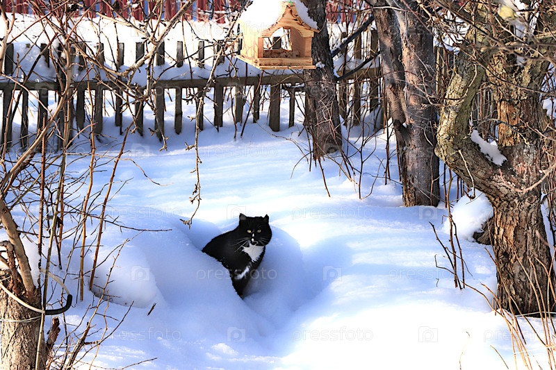 Пушистый, пухлый кот сидит в сугробе под кормушкой для птиц, пытаясь украсть немного сала. Сильные зимние морозы не задевают сибирских кошек, которые не боятся холода. Понятие сострадания