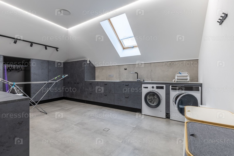 Просторная чердачная прачечная со встроенной бытовой техникой, серым минималистским шкафом, металлической стойкой для сушки одежды и корзинами для белья под ярким световым небом