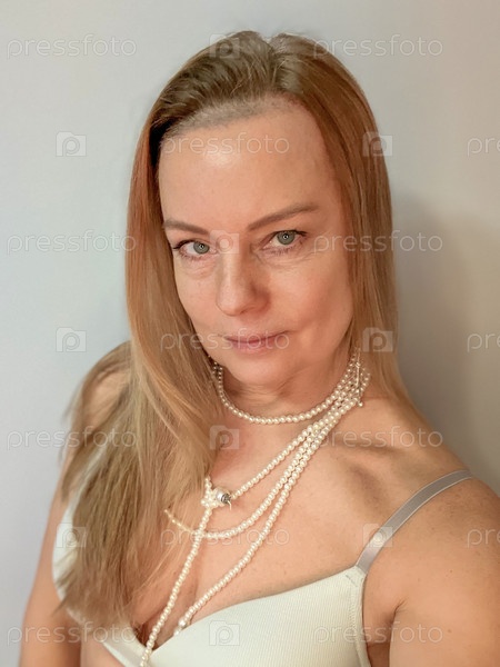 Портрет блондинки в 50 лет в синем топе