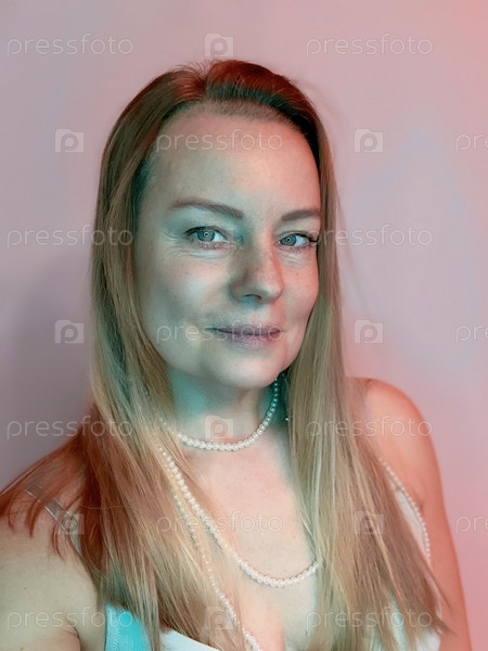 Портрет блондинки в 50 лет в синем топе