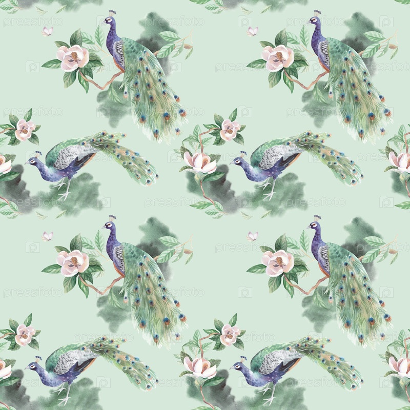 Бесшовный узор павлинов и магнолий на светло-зеленом фоне. Иллюстрация акварели ручной работы. Для карт, обложки, обоев, принтов, этикеток продуктов и ткани