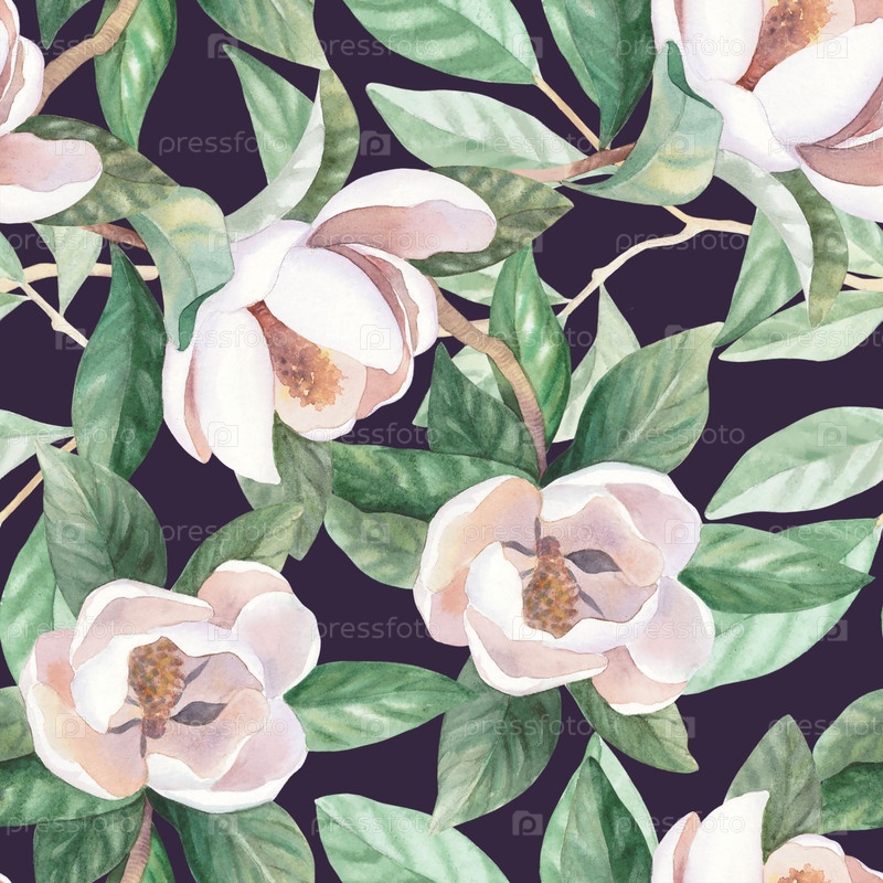 Бесшовный рисунок цветущей белой магнолии на фиолетовом фоне. Иллюстрация акварели ручной работы. Для дизайна упаковки, карт, крышки, обоев, принтов, этикеток продуктов и ткани
