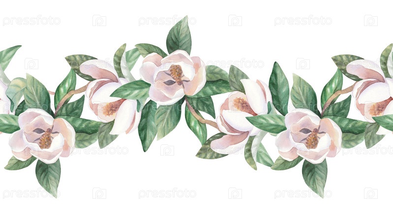 Горизонтальный каркас бутонов и листьев магнолии. Иллюстрация акварели ручной работы. Для дизайна упаковки, карт, крышки, обоев, принтов, этикеток продуктов и ткани
