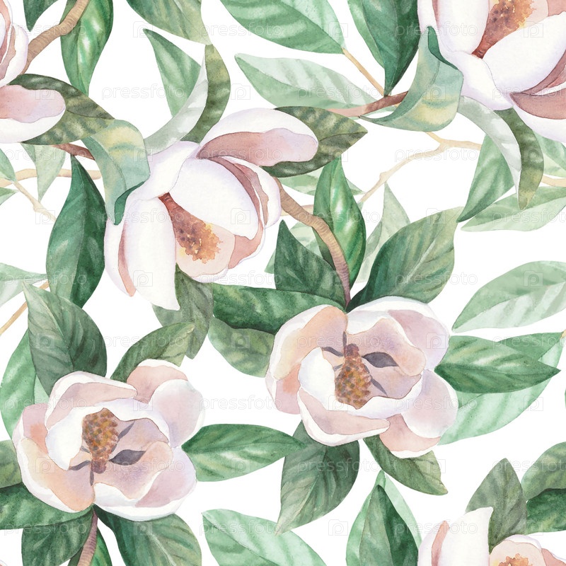 Бесшовный узор цветущей белой магнолии. Иллюстрация акварели ручной работы. Для дизайна упаковки, карт, крышки, обоев, принтов, этикеток продуктов и ткани