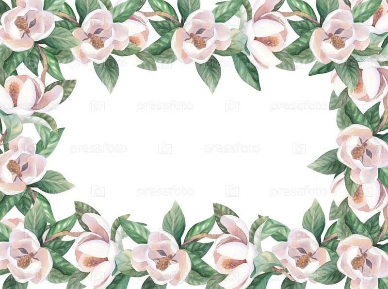 Квадратный каркас белой магнолии. Иллюстрация акварели ручной работы. Для дизайна упаковки, карт, крышки, обоев, принтов, этикеток продуктов и ткани