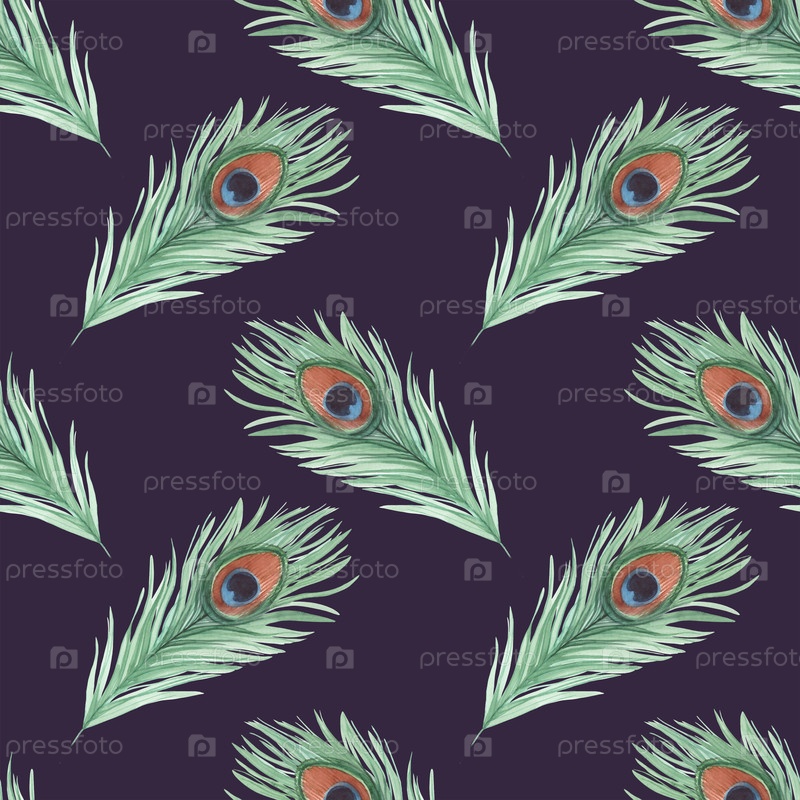 Бесшовный рисунок павлиньих перьев на фиолетовом фоне. Иллюстрация акварели ручной работы. Для дизайна упаковки, карт, крышки, обоев, принтов, этикеток продуктов и ткани