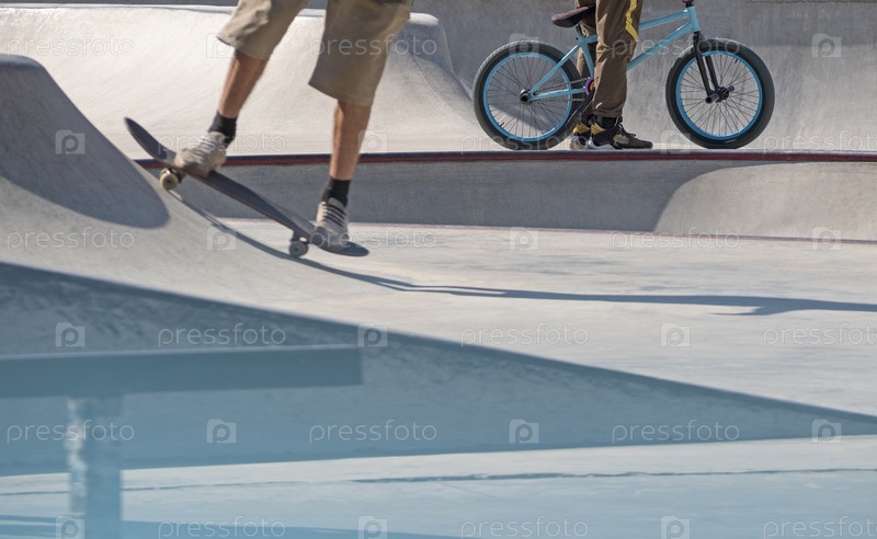 Молодые активные мужчины катаются на скейтборде и велосипеде BMX в бетонном скейтпарке