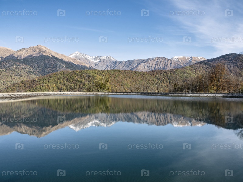 Водное отражение гор на курорте Роза Хутор в солнечный день