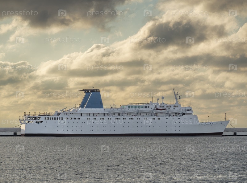 Пассажирское судно на якоре в порту. Морской транспорт для круизных путешествий