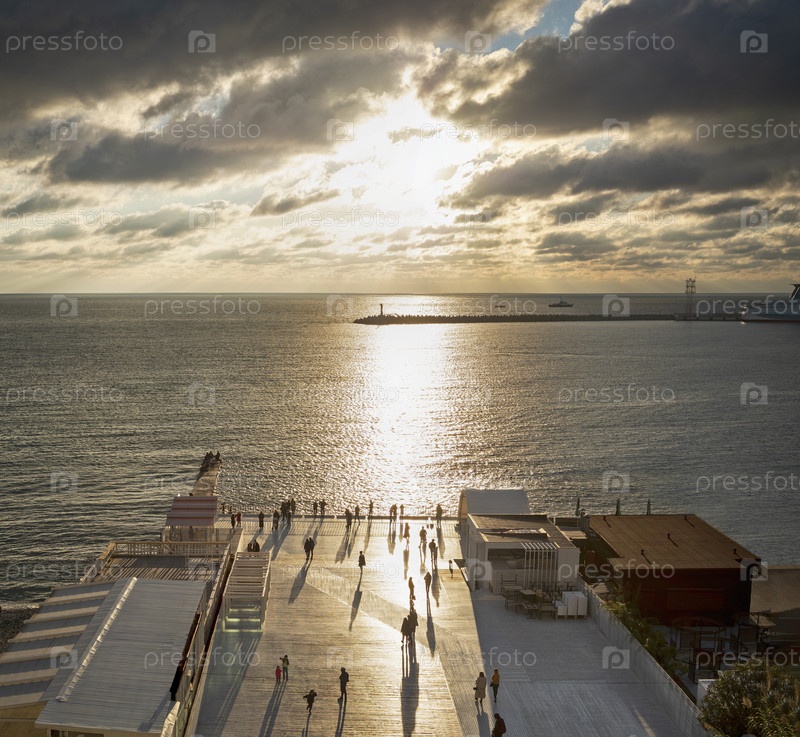 Силуэты людей на приморской набережной на закате неба и фоне морской воды