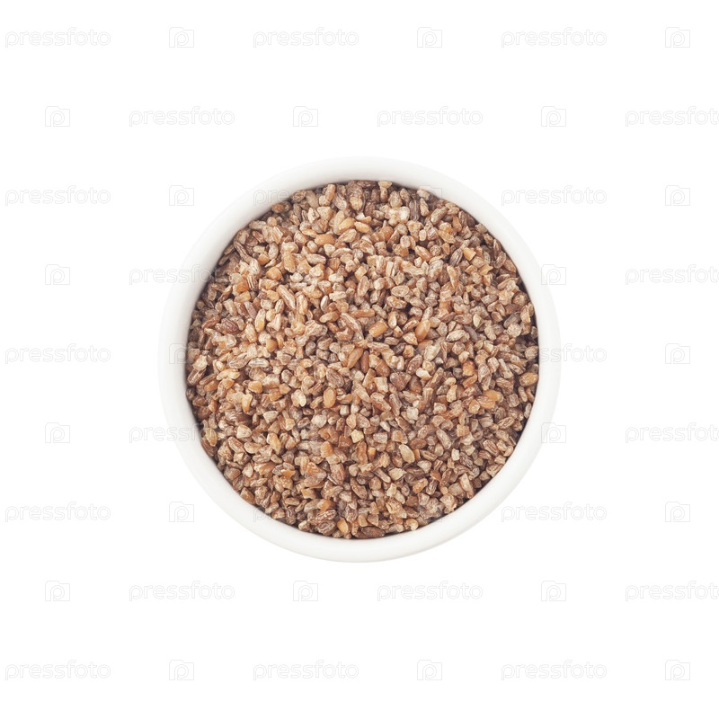 Верхний вид зерновых булгуров в круглой чаше, изолированной на белом фоне